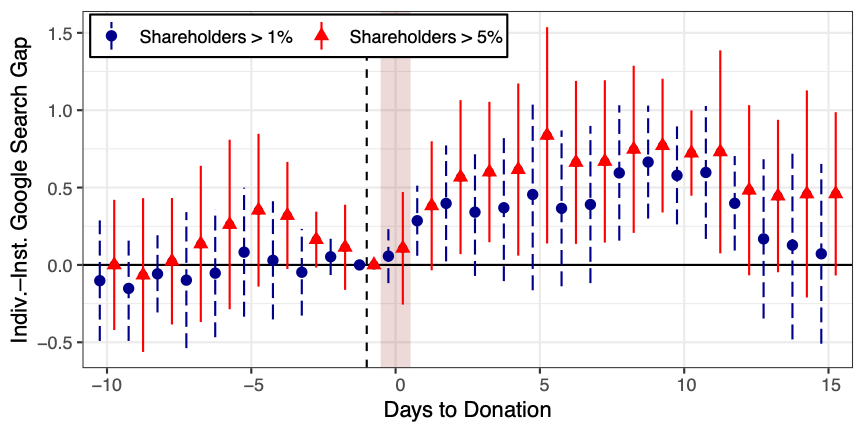 To capture reputational effects, we track Google Search activity. After a firm listed on the S&P      donates or exits a market, searches for individual shareholders surge—often doubling—over the next two weeks, while searches for institutional investors remain flat. Figure 1 illustrates this divergence: the gap in search intensity is especially pronounced for large individual shareholders (red triangles), who are more strongly associated with their firms. To give a sense of scale, a 0.4 increase in the gap on the Y-axis translates into about a 75% jump in search activity.  The reputational payoff is therefore concentrated among visible individuals, while financial institutions remain largely anonymous.