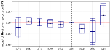 These reputationally driven choices had tangible economic consequences. Firms that donated heavily or exited Russia abruptly saw investment, productivity, and profitability fall by 1–3 percent, with adverse effects persisting for up to two years. Figure 3 illustrates this dynamic: the left panel shows that earnings per share declined, while the right panel highlights rising restructuring costs. In practice, these firms reduced investment, posted weaker earnings, and incurred significant charges to reorganize operations—all outcomes that shareholders without reputational gains were left to absorb.