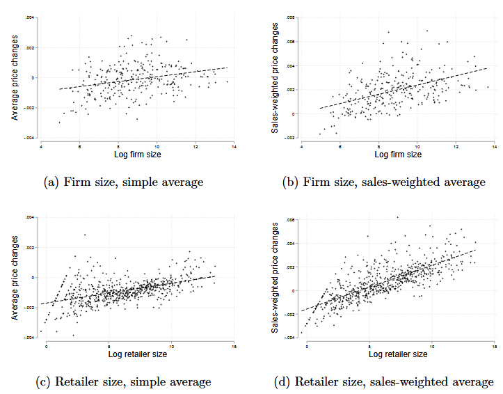 When we look beyond individual products to the firm and retail-chain level, a clear pattern emerges: bigger players raise prices more when inequality grows. Sellers whose sales are concentrated in large-market-share products tend to show higher average prices in more unequal markets, while those selling relatively more small-market-share products move in the opposite direction. Figure 1 shows this relationship: it plots the average price change from a one–standard–deviation increase in inequality in 2004, distinguishing between firm size (top panels) and retailer size (bottom panels). The left panels show simple averages across all products sold by a firm or retailer, while the right panels weigh each product by its sales to reflect its importance in the seller’s portfolio. In both cases, the slope is upward—larger firms and retailers are more likely to raise prices as inequality rises, while smaller ones are more likely to lower them.