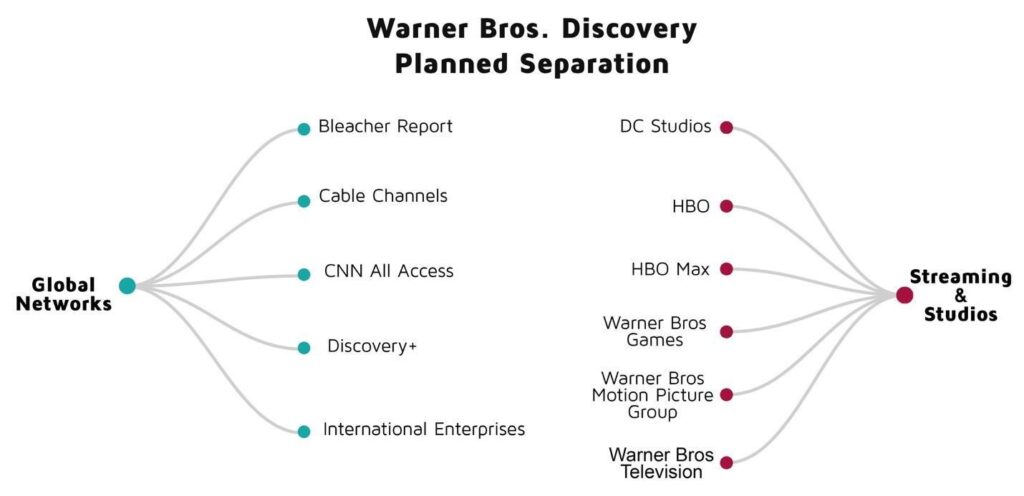 In June 2025, WBD announced a plan to separate into two publicly traded companies: one housing the studios (content production and distribution) and direct-to-consumer streaming operations, and another housing the Global Networks division and related digital products. WBD framed the separation as a value-unlocking move that would give each business a sharper strategic focus and a capital structure aligned with its cash-flow profile, especially by placing most of the company’s debt with Global Networks. In practical terms, the plan walked back the central 2022 integration thesis—that combining large-scale linear networks with studios and streaming would produce durable synergies. WBD acknowledged that the declining economics of legacy cable can weigh on the valuation and execution of the firm’s growth-oriented production and streaming businesses.