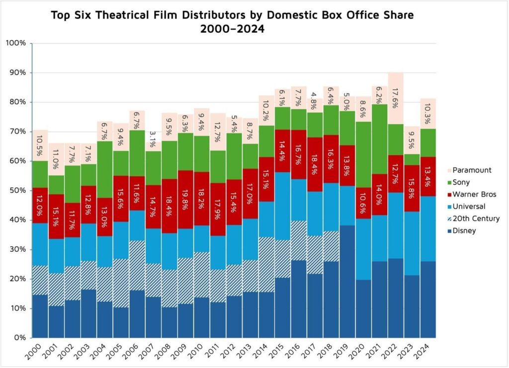 In an already oligopolistic theatrical distribution market, a Paramount/Warner merger would remove a significant independent rival for wide releases, increasing concentration and bargaining leverage in negotiations over screens, windows, and revenue splits.