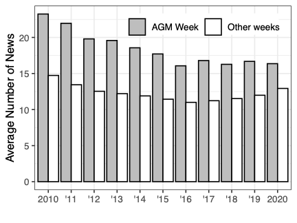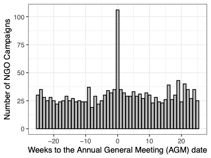 Our analysis begins with a striking empirical pattern. As shown in Figure 1, NGO campaigns are five to six times more likely to occur in the week of a firm’s annual shareholder meeting than in other weeks, and media attention to the targeted firm peaks at the same time.