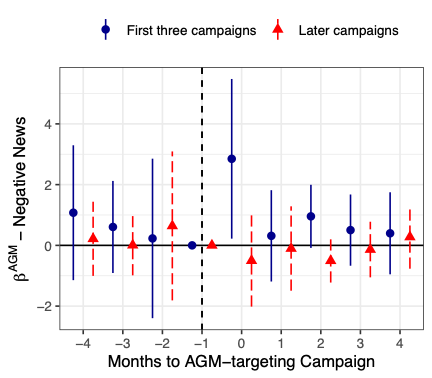 Figure 2 illustrates this dynamic. During an NGO’s first few campaigns, AGM-day actions generate large spikes in online searches for the NGO and sharp increases in negative media coverage of the firm. Later in the NGO’s life, the same actions produce little additional visibility, reflecting diminishing returns as name recognition grows.