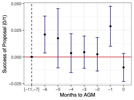Campaigns launched one to three months before the AGM increase the likelihood that related ESG shareholder proposals succeed and raise support when proposals go to a vote. The left panel of Figure 3 shows this pattern clearly: campaigns between one and three months from the AGM generate an additional 8% share of the vote in support of ESG.