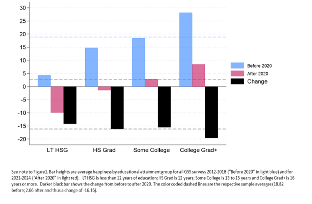 The most highly educated Americans show a similar drastic drop in levels of happiness. Historically, Americans who graduated college reported the highest levels of happiness, with those who did not graduate high school showing the lowest levels of happiness. This pattern still holds after Covid, but while those who did not graduate high school reported a change of negative 14 percentage points, those who graduated college experienced a drop of about 20 percentage points.