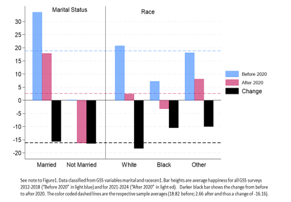 Happiness among Americans collapsed during the Covid-19 pandemic and has not recovered since. Using data from the General Social Survey (GSS), Sam Peltzman, a professor emeritus at the University of Chicago Booth School of Business and former faculty director of the Stigler Center, finds in a new working paper that declines in happiness have hit hardest white Americans, those with high incomes, the college-educated, and those who are politically right-leaning. Historically, these demographics have reported being the happiest. Before and after the pandemic, being married is one of the strongest indicators of happiness.