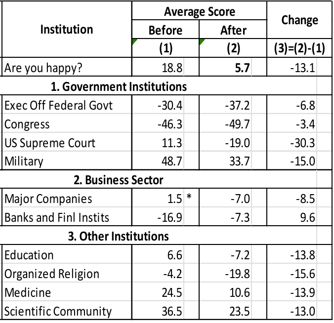 Other variables Peltzman includes in his analysis that would intuitively relate to decreases in overall happiness include opinions Americans have of each other. Since Covid, Americans are significantly less likely to report believing they can trust other Americans (change of negative eight percentage points), that they are helpful (negative 6.5 percentage points) or are fair (negative 15.7 percentage points).