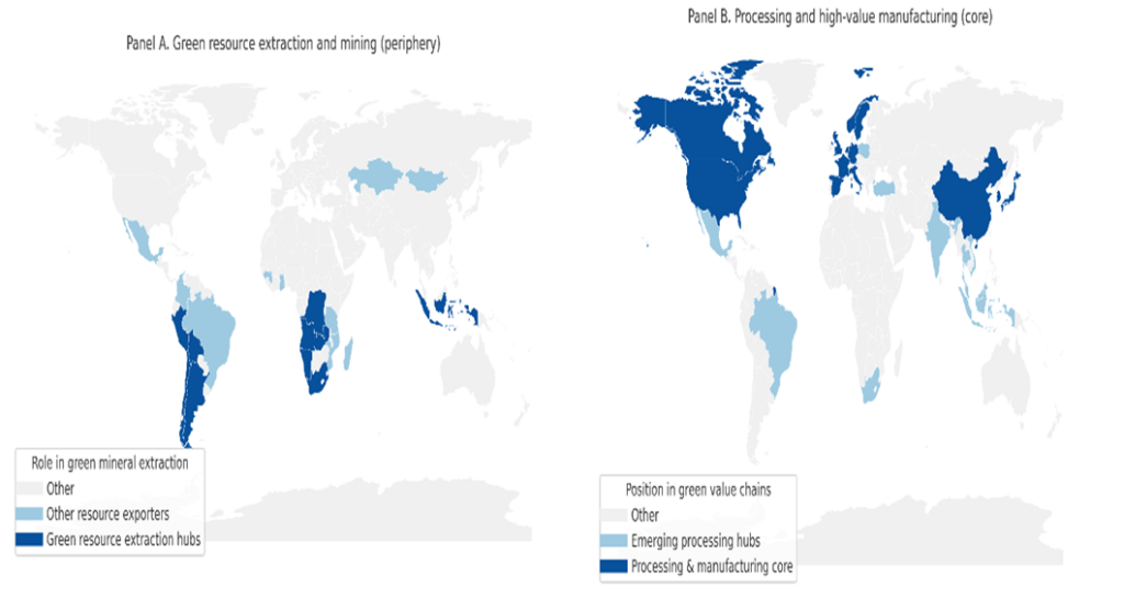 Figure 2 illustrates this asymmetry across critical minerals: extraction is concentrated in the Global South, while refining and higher value-added processing are dominated by China and advanced industrial economies. The green transition is not flattening industrial geography but reorganizing it along updated lines of hierarchy.