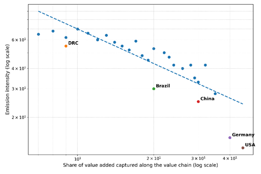 This unequal distribution of value and control has direct implications for the pace of decarbonization. When most value, technology, and decision-making power are concentrated in a small number of countries and firms, incentives to invest in clean technologies become fragmented across the system. Countries specializing in extractive or low-value segments often have limited fiscal capacity and weaker incentives to invest in costly clean technologies. Countries capturing higher rents can externalize part of their emissions along the supply chain.