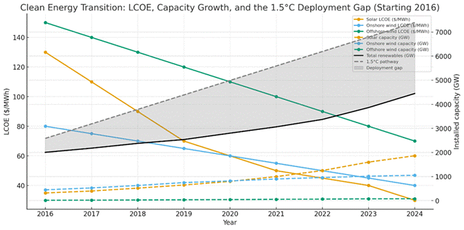 Yet, global emissions are not declining at the pace required to meet our climate targets. Despite unprecedented technological progress, the world remains far from a trajectory to keep global warming below 1.5 degrees celsius of pre-industrial levels,  consistent with the 2016 Paris Agreement. Figure 1 makes this tension visible: clean energy costs have fallen sharply, and installed capacity has expanded rapidly. Yet, deployment remains far below what a 1.5°C-consistent pathway would require.